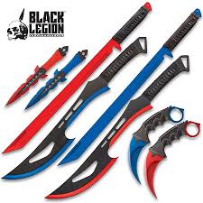Fire And Ice Battle Set – Stainless Steel Blades w/ Sheaths. Fierce in design and formidable in construction. Our Fire and Ice Battle Set melds both fantasy and function into a collection of expertly crafted blades. Inspired by contrasts and the elements, on the Fireside, you get vivid red stainless steel blades, which look hot enough to burn, and, on the Ice side, the cool blue stainless steel blades look like they would freeze whatever they touched. Each set includes a fantasy sword, a wakizashi sword, a karambit, and a set of three throwing knives. Both the swords and the wakizashi have a solid, one-piece construction of stainless steel with either a hot red or cool blue metallic theme.