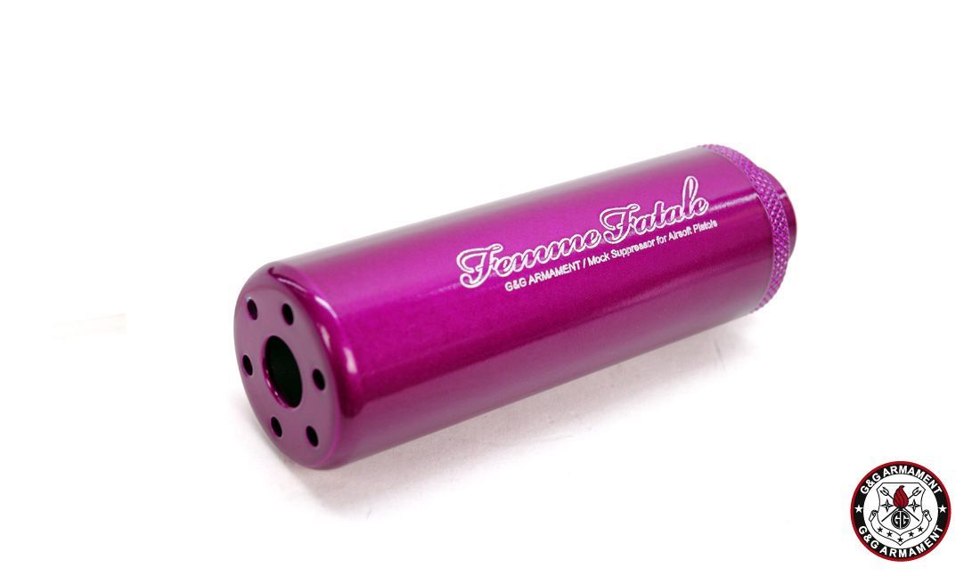 Full metal barrel extension with a pink glossy finish.14mm counter-clockwise threads allow it to be used on most airsoft guns with a threaded outer barrel.Made of lightweight aluminumSays Femme Fatale on the side.