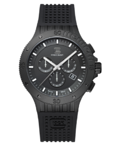 The durable black stainless steel case houses a dial that balances boldness with clarity. Silver-tone hands and indices, infused with Swiss Super-LumiNova®, glow brilliantly in low light, so you never miss a second. Pairing this rugged construction with a hypoallergenic silicone strap featuring GLOCK’s signature RTF texture, the watch wraps your wrist in ergonomic comfort and secures with unwavering stability—even during high-intensity activities. Sweat-proof and flexible, the strap adapts effortlessly to your pace, letting you tackle every challenge hands-free.