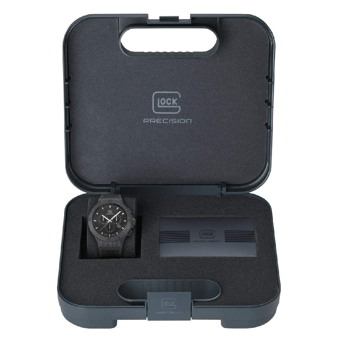 The GLOCK Precision Chronograph Watch lands exactly where uncompromising performance meets striking design. Crafted for those who demand reliability under pressure, this timepiece channels GLOCK’s legendary engineering into a bold, 44 mm silhouette. Its confident black-on-black aesthetic makes an immediate statement, while Swiss expertise ensures each tick embodies flawless precision. Whether you’re sealing a deal in the boardroom or charting a remote course off-grid, this watch stands ready to elevate your style and sharpen your edge.