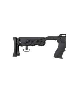 The ambidextrous stock is made of aluminium, tactical type, with a rubber butt plate and support piece, adjustable both in height and length, and the cheek piece is only adjustable in height. It includes an accessory for the butt plate, for competition shooting.