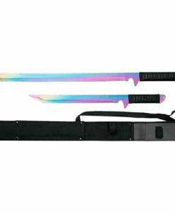 The HK-1070RB Twin Samurai Sword Set is a stunning dual-blade collection, perfect for enthusiasts and collectors. Featuring stainless steel blades with a matte titanium-treated rainbow finish and Japanese inscriptions, these swords embody elegance and precision. The black cord-wrapped handles ensure a firm grip, while the 2-in-1 nylon sheath with a shoulder strap provides easy carrying and storage.