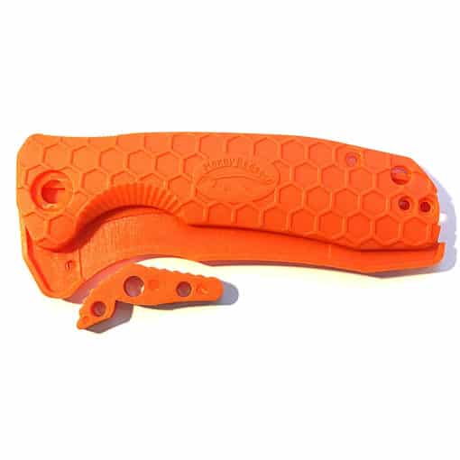 This HONEY BADGER HB5038 is a 3 Piece set of Orange Honey Badger Knife Handles. There are 2 sides of the handle plus an Orange backspacer in a set. Moreover, all items are made from Fiberglass Reinforced Nylon (FRN).