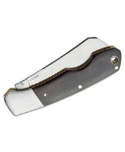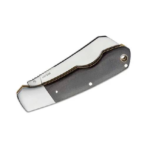 - Polished canvas micarta handle; steel bolsters with brass liners