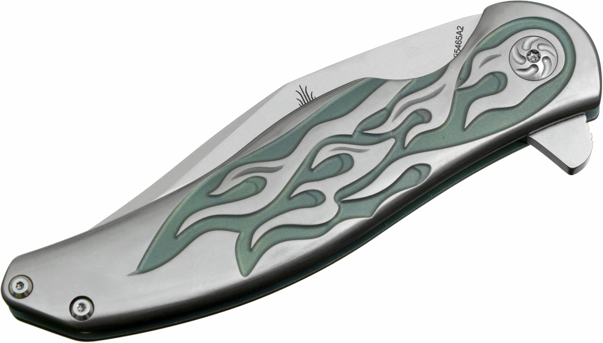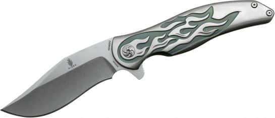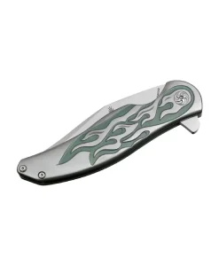 Designed for those who demand the best, the Compadre Flame boasts a sleek and robust construction, featuring premium materials and precision engineering. The blade, expertly crafted from high-quality CPM-S35VN stainless steel, offers exceptional edge retention, corrosion resistance, and toughness, ensuring it can tackle any cutting task with ease.But it’s not just about utility – the Compadre Flame is a work of art in its own right. The unique flame-like pattern etched onto the blade adds a touch of sophistication and style, making it a standout piece in any collection.With its ergonomic handle crafted from durable titanium, this knife provides a comfortable and secure grip for extended use. The titanium frame lock mechanism ensures reliable blade deployment and rock-solid lockup, giving you confidence in every cut.