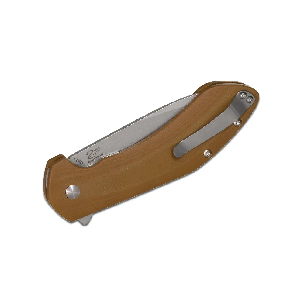 The Vanguard V4479A2 Kala flipper by Kizer Cutlery is a collaborative project between Kizer and custom knifemaker Scot Matsuoka of Koloa Duck Knives. It is a production version of Scot’s custom Kala flipper, a blade we absolutely love here at the KnifeCenter and now happy to see a Vanguard version with a more affordable price tag. It’s slender yet large enough for hard-use tactical and EDC tasks. It features a 3.75″ VG10 drop point blade with an ever-so-slight recurve to the edge. The pivot bearing system allows for smooth blade opening, as with all Kizer knives, and the action is quick, snappy and ultra-authoritative. The coyote brown G10 handle has a solid, stout feeling and is extremely ergonomic making this a great EDC choice. It features a stainless steel spring pocket clip, stainless steel liners and is sure to become an everyday carry favorite in no time since it’s priced well below its design and quality levels.