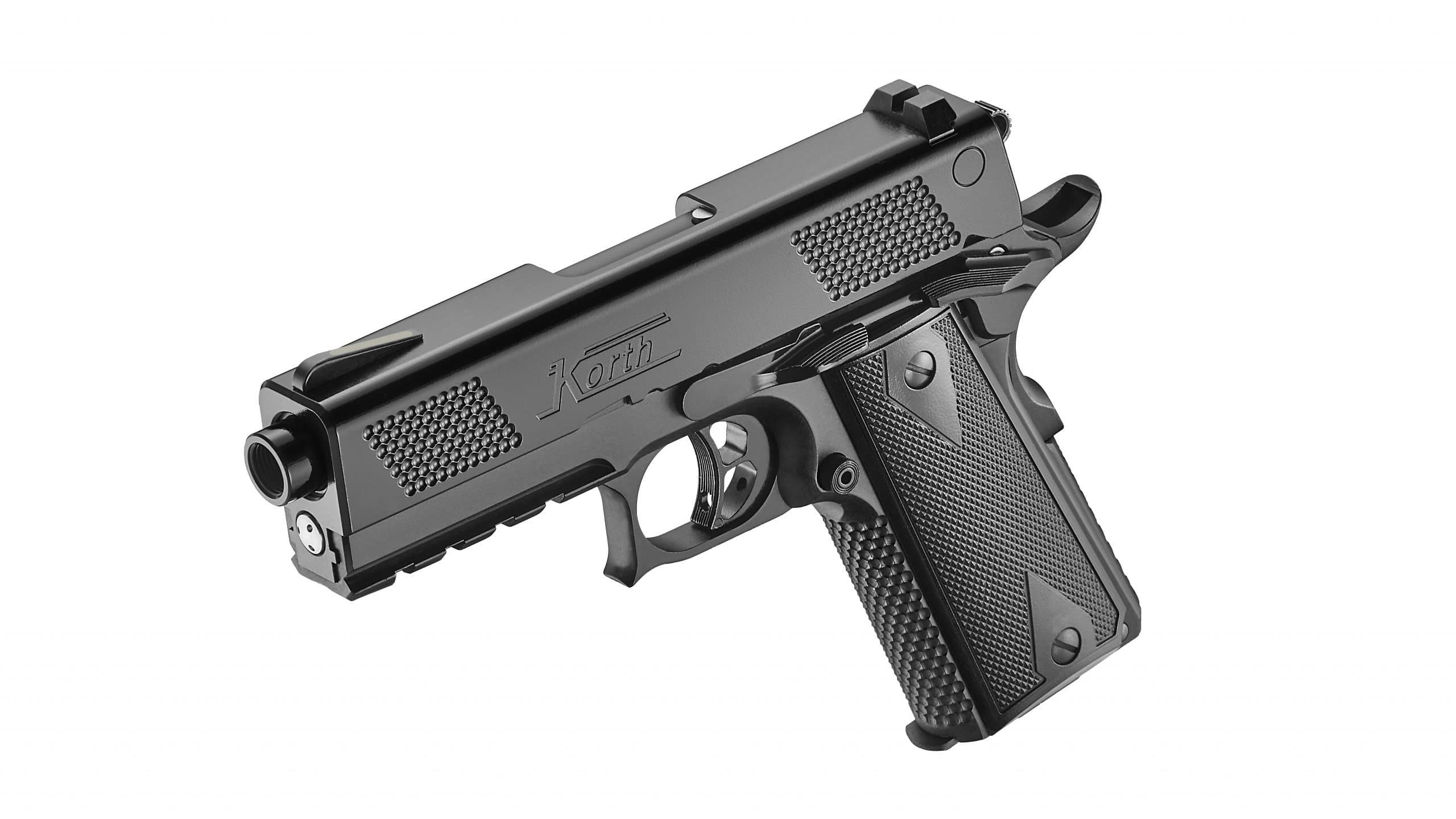Korth Licensed 1:1 scaled aluminum slide and receiver. Hard-anodized finish aluminum fixed outer barrel to improve shooting stability and also accuracy. Tokyo Marui spec compatible H-up set and chamber, steel hammer, inner barrel, H-up bucking, and 1911 grip plates also.