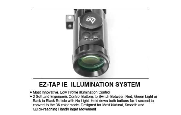 When daylight fades, count on the patented EZ-TAP® Illumination Enhancing System (U.S. Pat. 8,437,079) to light your reticle in vibrant red, green, or any of 36 colors. Instantly toggle through brightness levels with one tap, and let the 1-Click Memory Feature lock in your favorite setting—so you’re always back where you left off, ready for the next shot.
