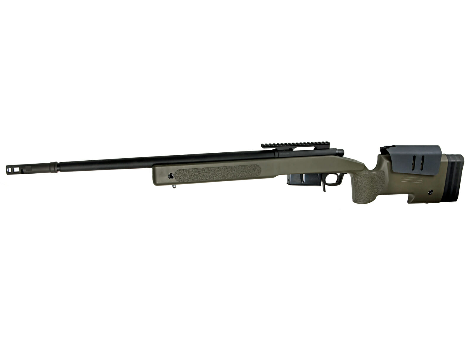 The M40A5 is a fully licensed bolt-action airsoft sniper rifle. It is a 1/1 scale replica of the latest sniper rifle platform used by the United States Marine Corps. It has all the standard M40A5 features, such as an adjustable cheek rest and stock to make it more comfortable for the user and a rail for mounting scopes.