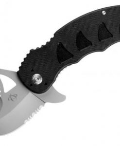 The Snaggletooth series are very interesting folding pocket knives. In the realm of knife fighting, these are very effective weapons. The “bump” on the top of the blade is used in a variety of ways, generally the opponent’s body is utilized to open the main blade. These also have a “little finger” ring that is revealed with a button. This allows for other handling of this knife. It’s a great product and well made and reasonably priced, which is pretty typical of the Mantis products.