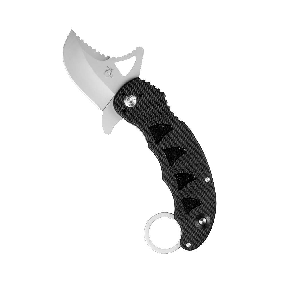 The Mantis MKF-813 uses their M-vx steel, bead blasted and partially serrated. The handle is very strong with thick stainless steel liners and grippy black G-10 scales with a milled shark tooth design. The Snaggletooth includes a reversible tip-down carry pocket clip.