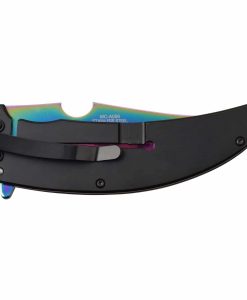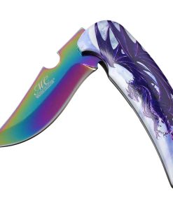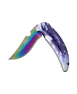 The MC-A056WRB Spring Assisted Knife is a durable and stylish everyday carry knife with an eye-catching design. Featuring a 9-inch overall length, this knife is equipped with a 4-inch 3Cr13 stainless steel blade with a polished tinite coating for enhanced durability. The 5-inch stainless steel handle showcases heat transfer artwork, adding a unique aesthetic appeal. Designed for smooth deployment, this knife includes a frame lock mechanism and a pocket clip for secure carry.