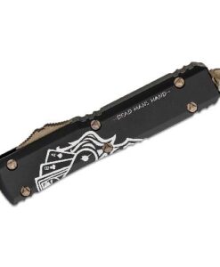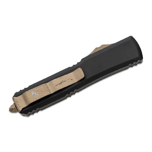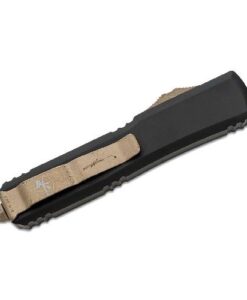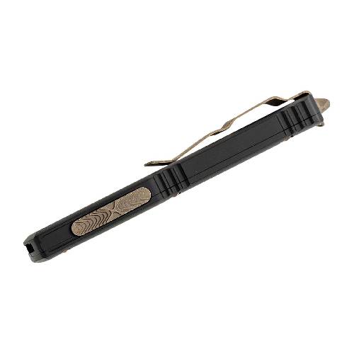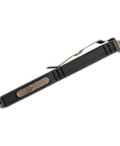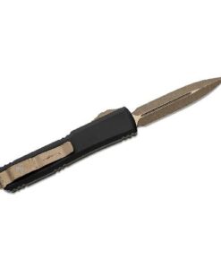 This model features a scalpel-sharp, double-edge dagger blade with a bronze apocalyptic finish, creating a striking contrast against the black anodized 6061-T6 aluminum handle. The enhanced tri-grip texturing on the thumb slide provides a secure grip, ensuring quick, confident deployment and retraction. Microtech’s patented spring mechanism keeps the spring at rest when not in use, maintaining consistent firing power over time.