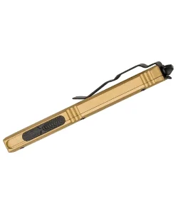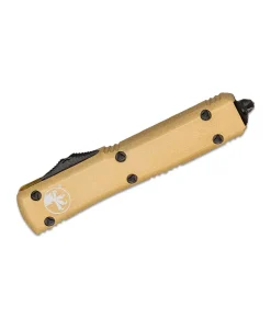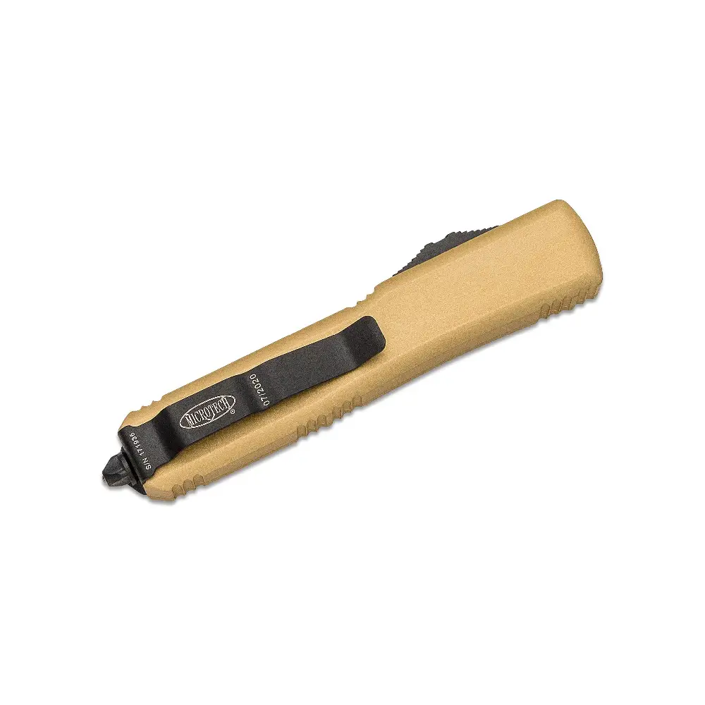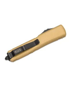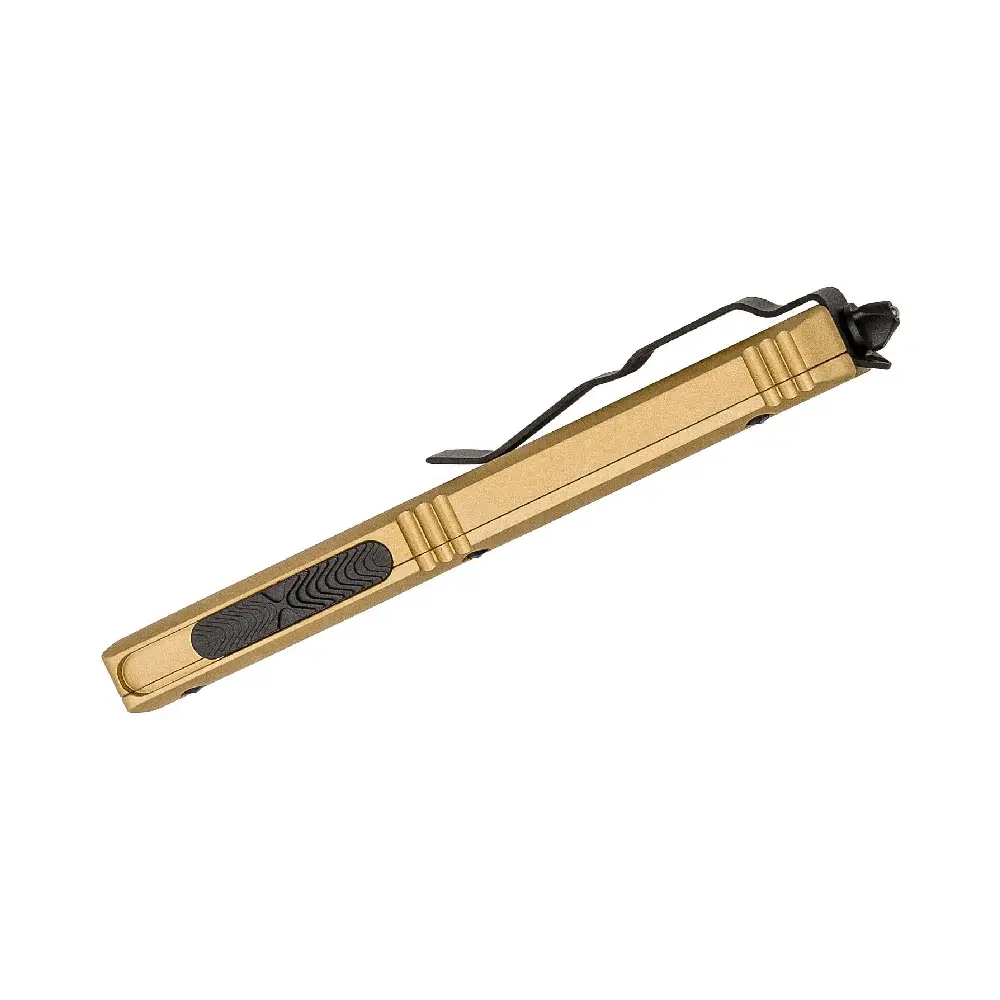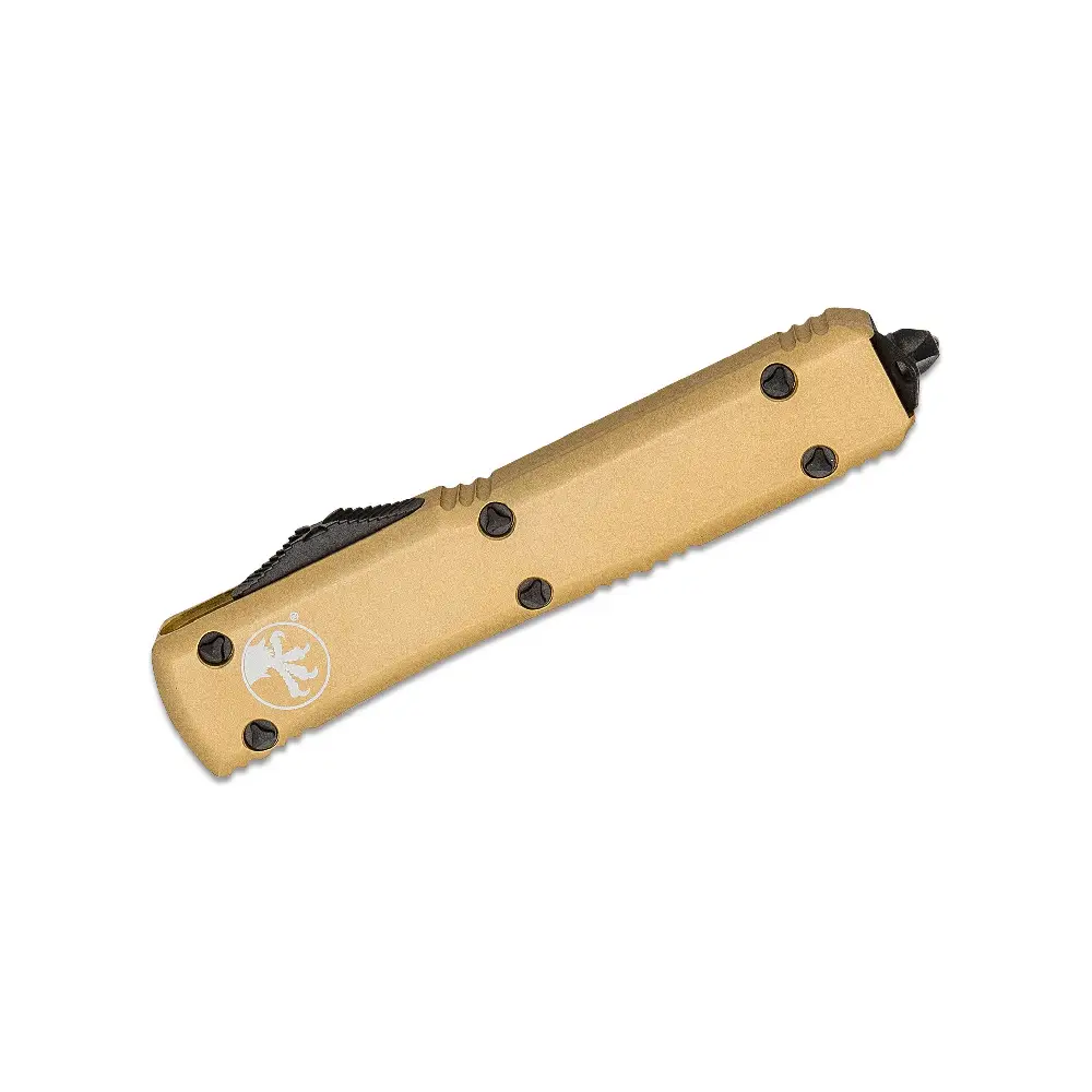 The MICROTECH 122-1CG D/E Knife is a high-performance out-the-front (OTF) automatic knife, designed with precision engineering and rugged durability. As part of the Ultratech series, this knife features a dual-action automatic mechanism, allowing for rapid deployment and retraction with a simple thumb slide. Its champagne gold anodized aluminum handle offers a sleek, ergonomic grip, making it both a functional tool and a standout addition to any collection.