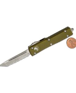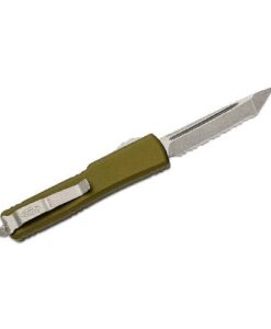 The Microtech UTX-70 149-12OD is a compact yet high-performance OTF knife, offering the same exceptional craftsmanship and reliability as its predecessor, the Ultratech, at just 70% of its size. Designed for effortless everyday carry, the UTX-70 features a tanto-style serrated blade, allowing for precise slicing and superior cutting power. Its OD Green anodized aluminum chassis ensures lightweight durability while maintaining a tactical aesthetic.