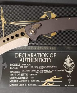 The Microtech Custom Hawk Automatic Knife is a bold, tactical masterpiece, designed for those who demand powerful performance and striking aesthetics. This custom edition features a bronze-finished hawkbill blade paired with a black anodized aluminum handle, delivering a lethal combination of style and function.