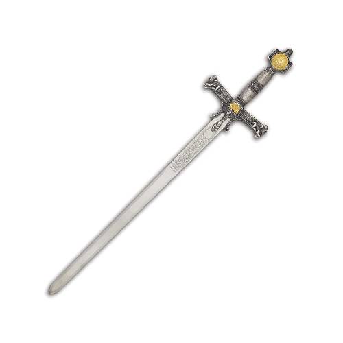 The short sword features a silver plated hilt, antiqued zamak handle and pommel accented with 24K Gold plated medallions. The images on the sword include the Star of David, Lions of Judea and the Ark of the Covenant.
