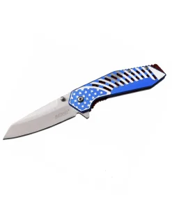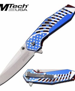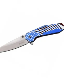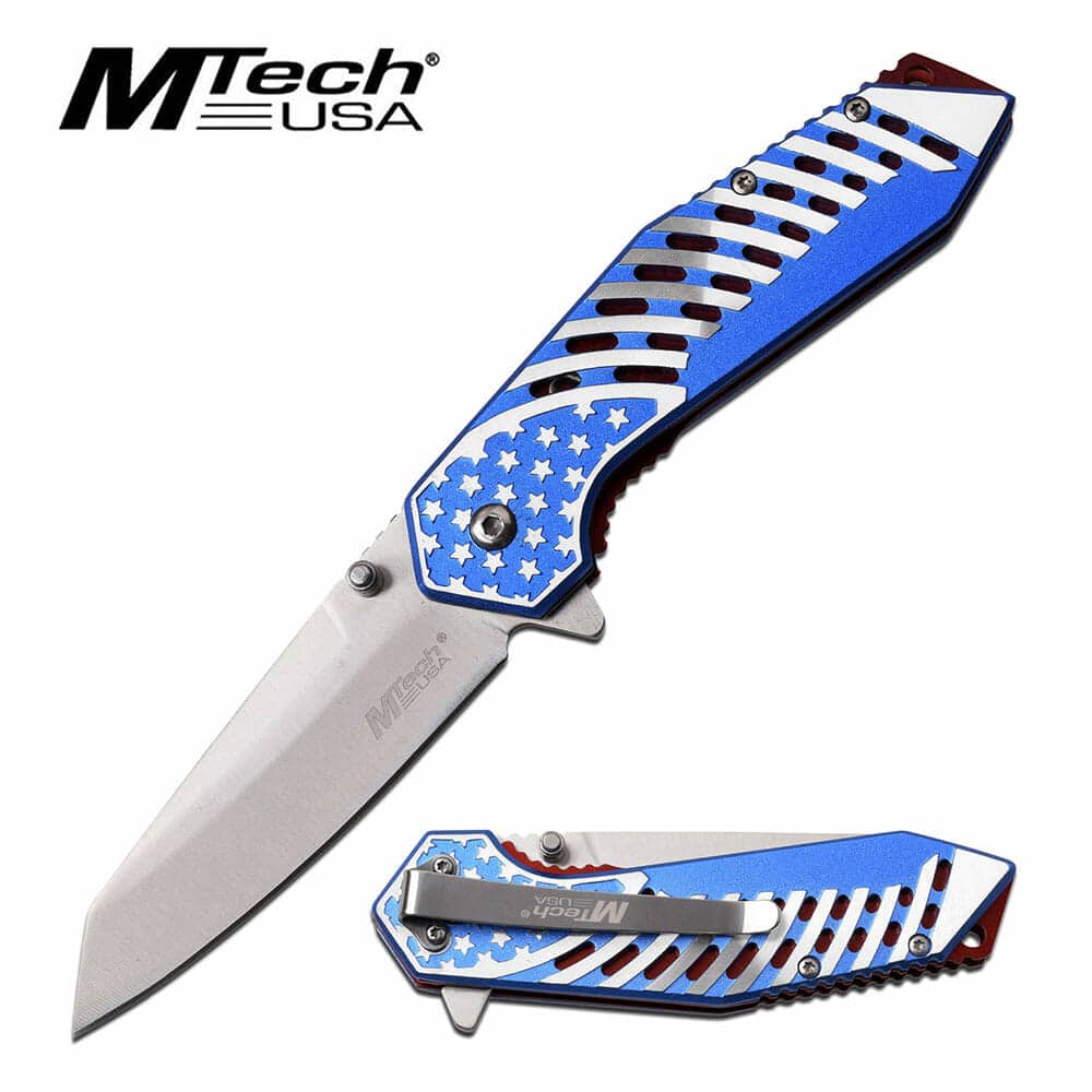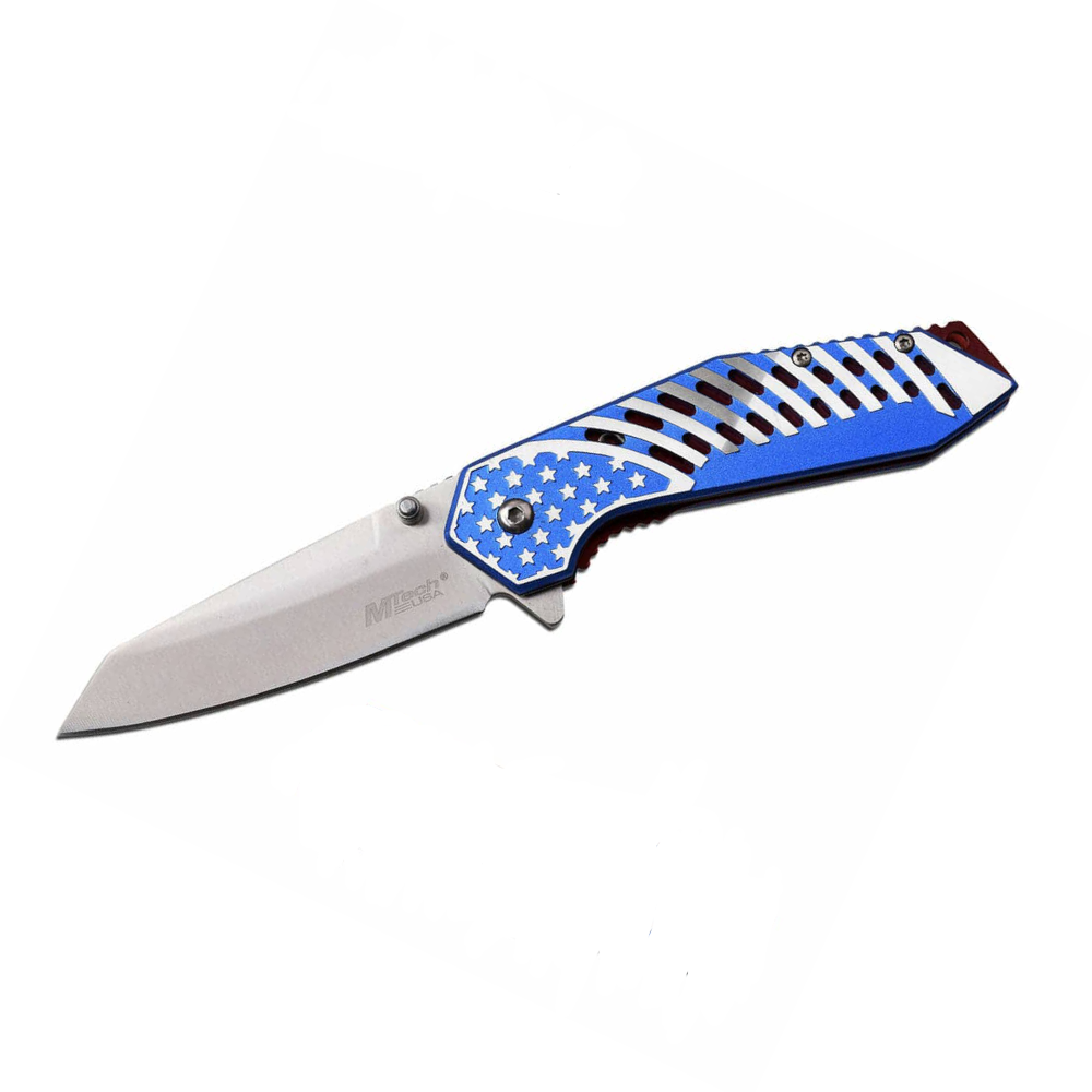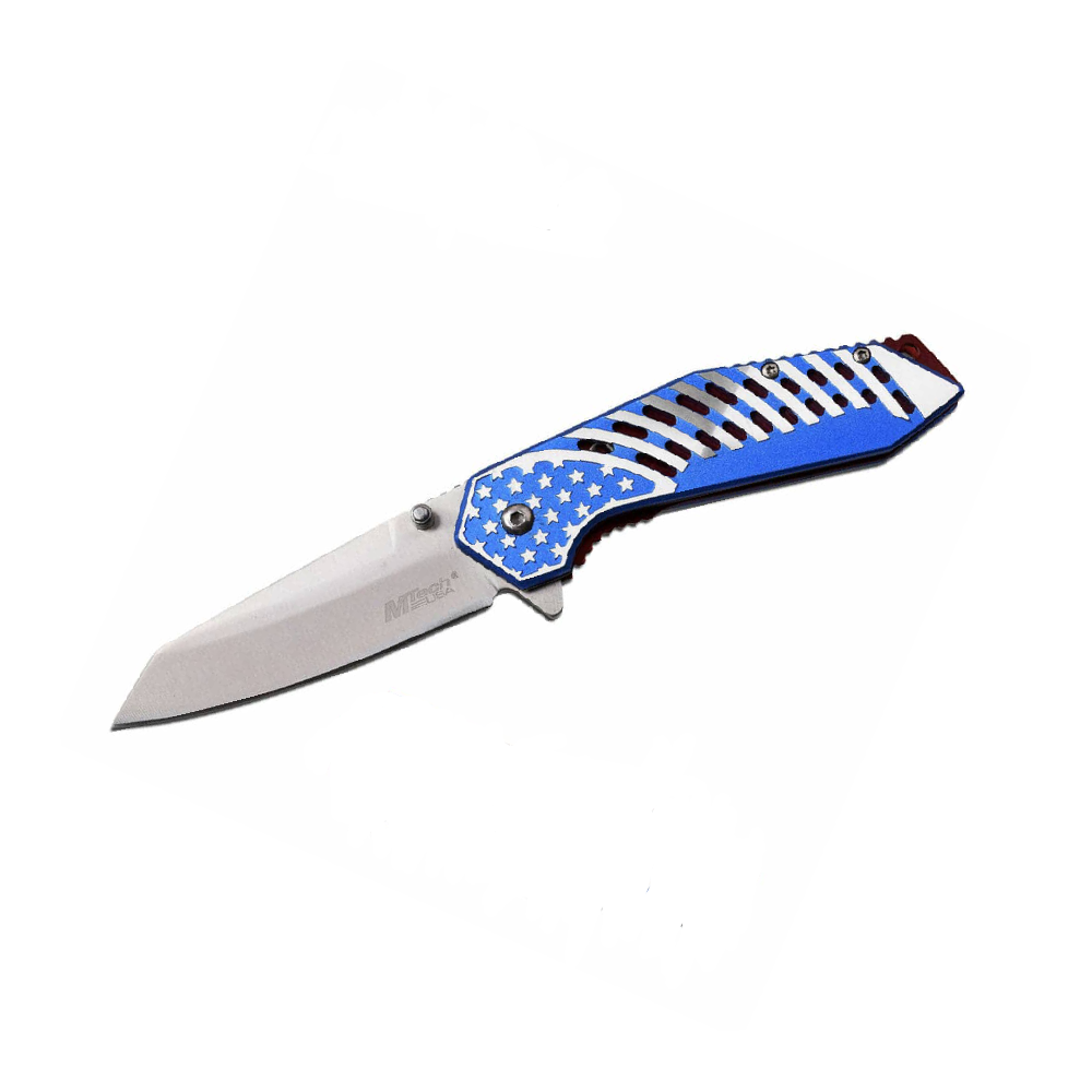 The MT-A1080 MTech USA Spring Assisted Knife is a durable and stylish folding knife, perfect for everyday carry and tactical use. Featuring a 3.25-inch stainless steel blade, this knife delivers sharp cutting performance with a spring-assisted opening for rapid deployment. The anodized aluminum handle with flag artwork adds a unique touch, while the pocket clip ensures easy carry.