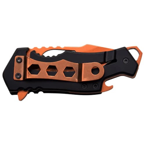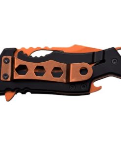The MT-A882O MTech USA Spring Assisted Knife is a compact and versatile everyday carry knife designed for durability and functionality. Featuring a 2.75-inch orange electroplated 3Cr13 stainless steel blade, this knife offers excellent corrosion resistance and cutting performance. The black nylon fiber handle provides a secure grip, while the frame lock mechanism ensures safety during use. Additional features like a bottle opener, hex wrench, and pocket clip make this knife a multi-purpose tool for outdoor and tactical needs.