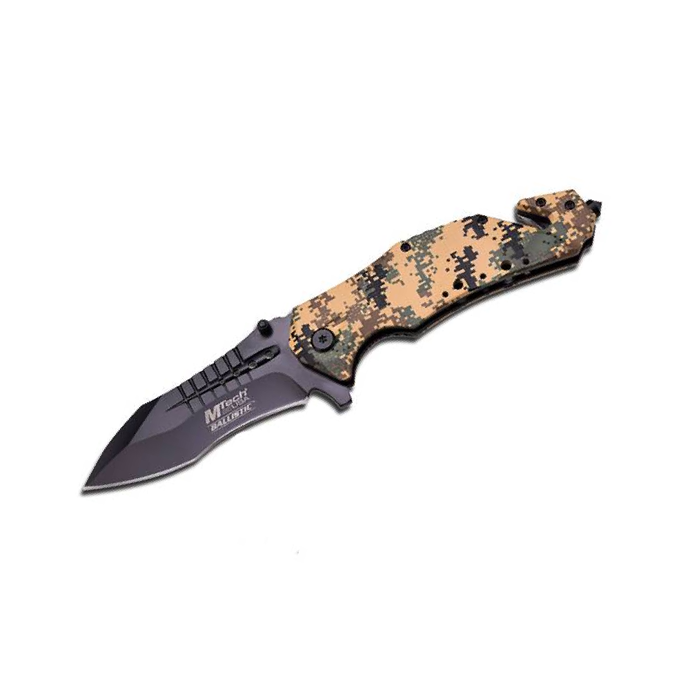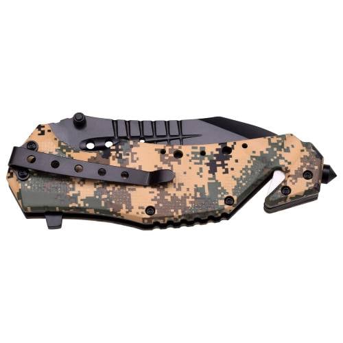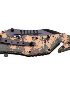 The MTech USA MT-A845DM Spring Assisted Knife is a rugged and versatile tool, designed for military, tactical, and everyday carry applications. It features a 3.75″ stonewashed 3Cr13 stainless steel blade with a thumb stud for easy opening. The desert camo-coated aluminum handle provides a secure grip and a tactical aesthetic. This knife includes a seatbelt cutter, glass breaker, and a pocket clip, making it an essential tool for emergency situations.