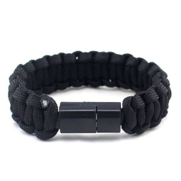 Paracord bracelet that comes with a built-in charger for iPhone. It is basically for that crucial moment when you need a charge to your phone.