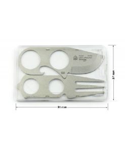 - Dimensions – Cutlery tool: credit-card size; Sleeve: 57 × 91 mm