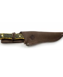 Beyond its functional prowess, this Bowie is your companion in the wild or on display at home. Slide it into the rich brown leather sheath, custom-molded for a snug fit and featuring contrast stitching that elevates its classic aesthetic. Whether you’re trekking through dense forests, preparing camp meals, or simply admiring its timeless design, this knife stands ready to perform.