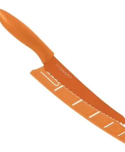 Like all Pure Komachi 2 knives, the Bread Knife offers brilliant performance. The bright colors on both blade and handle make Pure Komachi 2 knives fun to use and they add eye-catching color to your kitchen. What’s more, those bright colors have a purpose. The color-coding helps guard against cross-contamination of food—for instance, by using the knife you just used on the meat to cut the veggies. The coated carbon stainless steel blades, hand-sharpened to a 16° cutting angle, make quick work of most any kitchen task. The molded resin handles and comfortable and contoured for a secure grip. The blade coating is food safe and easy clean. While they are dishwasher safe, we recommend hand washing to prolong the life of your blade as well as the colorful blade coating. Pure Komachi 2 knives now come with a matching sheath for easy storage.