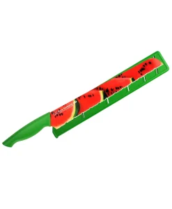 The Pure Komachi HD Melon Knife is part of the Pure Komachi HD series of knives that feature full-color, high-definition photography on razor-sharp, carbon stainless steel blades. This HD photographic coating looks spectacular and each blade has been double-coated for durability. The non-stick coating is food safe and easy to clean, too. Each knife comes with a color-matched sheath for safe and easy storage, too. These visually striking new knives will add color, fun, and brilliantly sharp cutting performance to your kitchen.