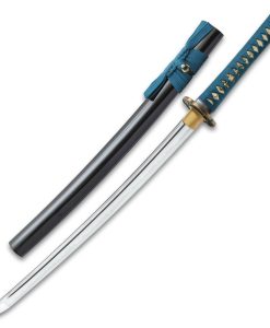 The tsuba and handle fittings are of solid brass with an aged bronze finish. The wooden handle has teal traditional cord wrapping over genuine, tea-dyed raw skin. A black lacquered and polished wooden scabbard with cord-wrapping houses the blade. Also includ with the Shikoto Longquan Master Teal Wakizashi Sword is a certificate of authenticity with forging specifications. It is sign by the master swordsmith who craft the blade.