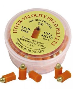 SKENCO HYPER VELOCITY FIELD PELLETS 4.5MM a HI TECH PLASTIC CUPS ARE PROVEN TO PROTECT FROM PREMATURE WEAR AND TEAR OF RIFLING. COPPER COATED METAL TIPS CREATE A SMOOTHER SURFACE REDUCING AIR FRICTION IN FLIGHT.