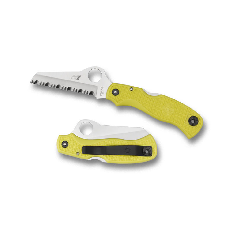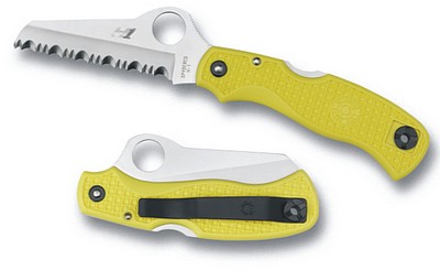 The oversized 14mm Spyderco Round Hole works for opening/ closing even if hands are gloved, cold or wet. Available in black or marine yellow, the fiberglass reinforced nylon resin the handle comes textured with a grip-sticking waffle pattern. An ambidextrous tip-up pocket clip also houses a lanyard hole for a variety of carry possibilities.