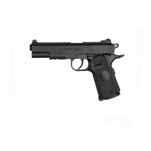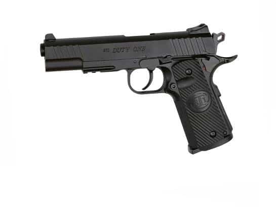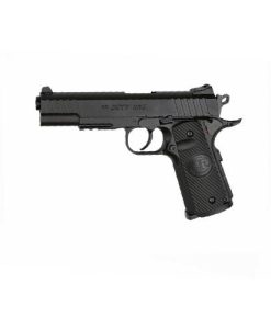 This Blowback version DUTY ONE is fully licensed by the famous high-end small arms manufacturer STI® International, based in Texas, USA. The 4.5mm (.177) steel BB’s are stored in the drop-out magazine and powered by a 12g CO2 cartridge which is cleverly kept away in the pistol grip thanks to the easy load system. The airgun is semi-automatic and based on the classic model 1911 but STI® has upgraded and changed the design and many of the functions. The frame has an integrated front weaver rail for mounting light and laser. The grip is marked with an STI® logo and the high rise beaver-tail grip secures a perfect hold on the pistol. Furthermore, the pistol has a unique serial number. The metal slide has beautiful authentic STI® markings.