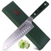 Incredibly razor sharp, full-tang, imported high-carbon German steel with a hand polished edge at 18 degrees per side. Precisely tempered and stain resistant. Hardness reach to HRC56±2.