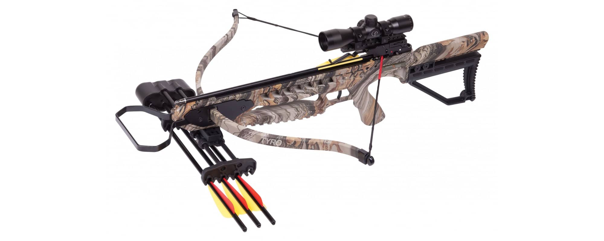 Every detail of the Tyro is tailored for a confidence-inspiring shoot. The 10.5-inch power stroke translates to optimal energy transfer and outstanding consistency; auto-safety cocking mechanism keeps you secure during loading; an ambidextrous composite/aluminum stock means both right- and left-handed shooters get an equally comfortable, steady hold. The distinctive “God’s Country” camo pattern ensures you blend seamlessly into any outdoor environment, while the included 4×32 mm crossbow scope puts accuracy at your command, even at range.