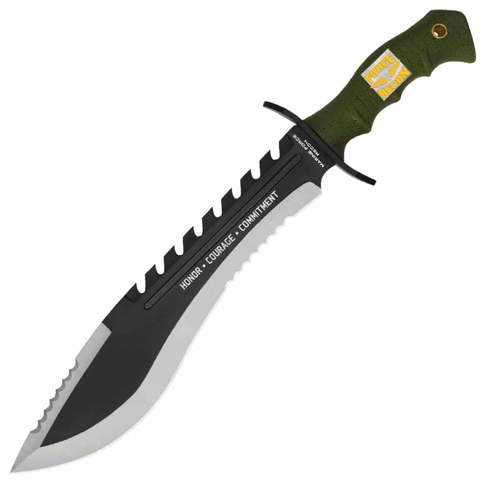 The handle, crafted from impact-resistant rubber polymer, features a textured surface that locks into your grip, even when wet or gloved. You’ll feel confident driving each chop with full power, thanks to the ergonomic contours that cradle your hand and minimize fatigue during extended use. Embedded in the pommel is a bold Marine Force Recon medallion—a constant reminder of the elite force this blade honors every time you secure your stance.
