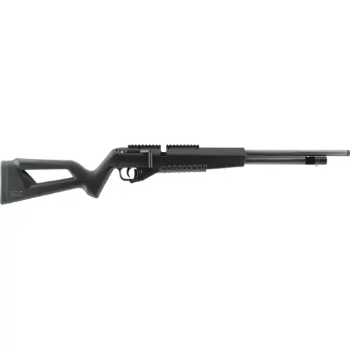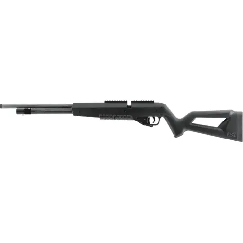 The UX Iconix features a rifled barrel with a length of 510 mm, an integrated pressurized steel cylinder with a volume of 100 cubic centimeters, a pressure gauge and a filling adapter. The operating pressure is 207 bar / 3000 psi. The rotary magazine and ergonomic cocking lever permit rapid firing of 10 5.5 mm (.22) pellets. A single shot tray is included as well, which allows the indiviual feeding of each pellet. The barrel features a muzzle thread with 1/2″-20 UNF.