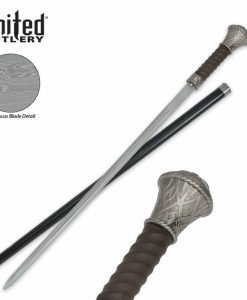 This fully functional fantasy sword cane from United Cutlery features a razor-sharp blade forged of beautiful Damascus steel. Moreover, Each blade is double-edged with a heavy, intricately cast pommel and leather wrappings on the handle. In fact, a coordinating wooden scabbard houses the blade and completes this exceptional design, only from United Cutlery.