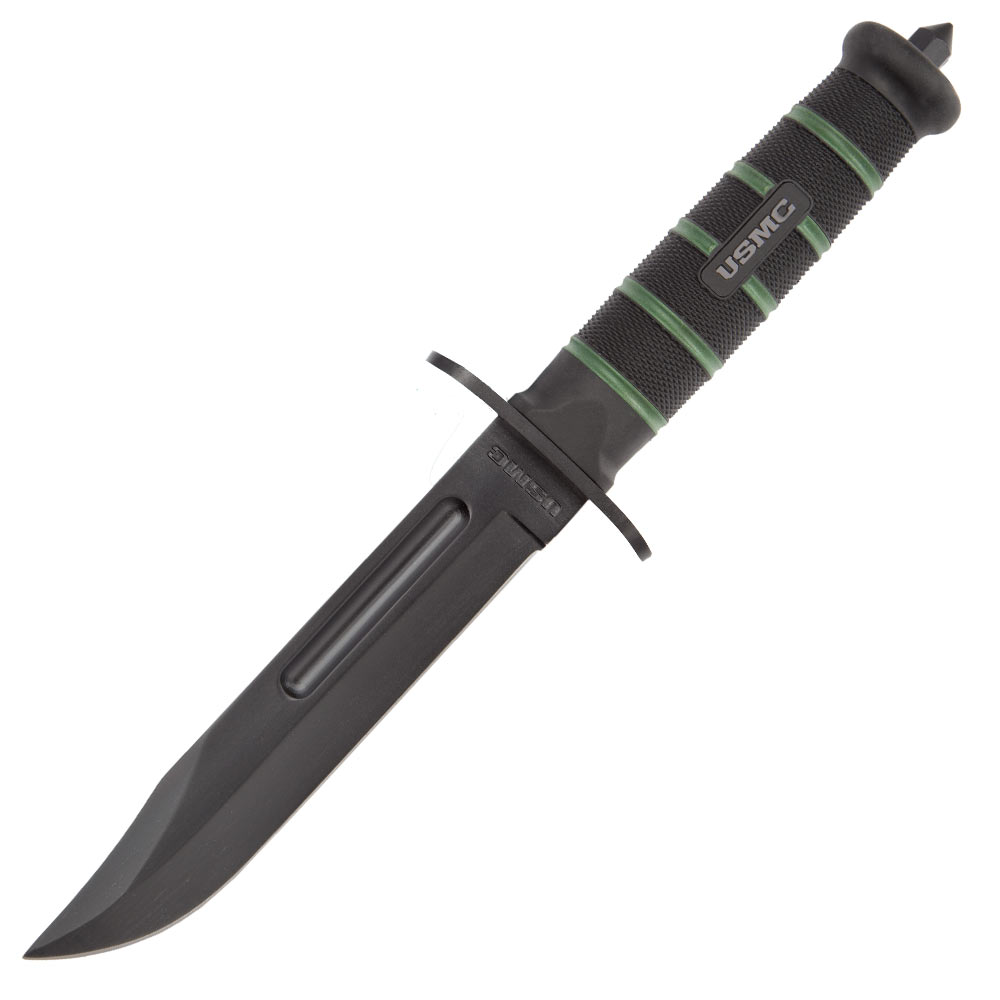 Fusing tradition and innovation, the USMC Blackout Combat Fighter is a modern take on a classic USMC knife design. Its 6 3/4″ 420 stainless steel blade features the clip point profile, nonreflective black coating, blood groove and ‘USMC’ stamp that combat fighter fans know and love. It’s a time-tested blade design that continues to prove its worth on present-day battlefields. Five green bands encircle the handle – an aesthetic nod to the classic combat fighter’s stacked leather handle. Retooled to satisfy the unique demands of the modern era, the Blackout Fighter’s injection-molded handle is extraordinarily durable and boasts a textured grip that virtually eliminates slippage, even when wet. A steel glass breaker is set atop the pommel – another contemporary addition that’s perfect for escaping entrapment (or assisting others). Add the included nylon belt sheath, and you’ve got a versatile setup that honors traditional wisdom, while taking full advantage of the latest innovations.