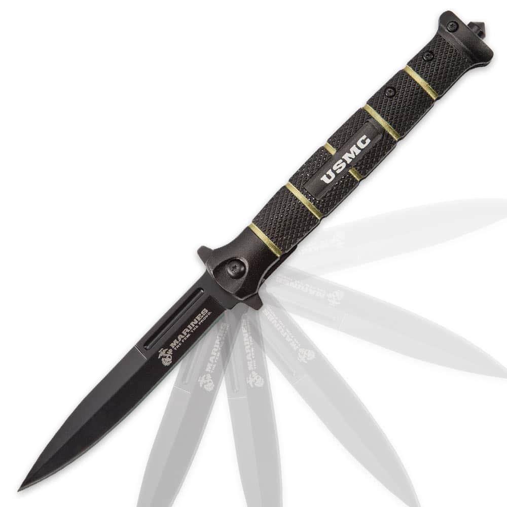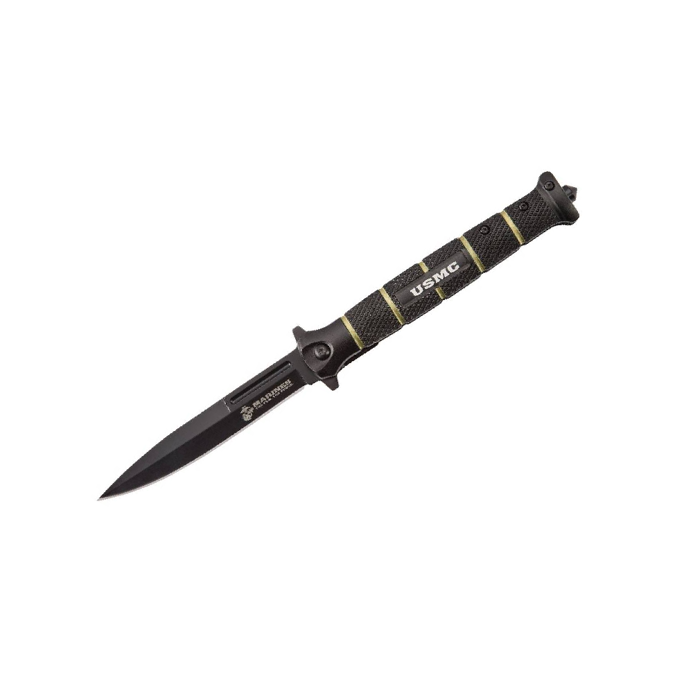 An undeniably modern take on a classic folding knife design, the officially licensed USMC “Blackout” Combat Stiletto combines all the wicked ferocity of the iconic stiletto with contemporary tactical appointments and styling. Its potent 4″ 420 stainless steel blade features the sleek spear point profile that old-school stiletto fans know and love and adds a distinctive blood groove and bold nonreflective black coating. Beautifully offsetting the blade’s matte black finish, the famous USMC seal is carefully laser etched in white next to the razor-sharp edge, flanked by the branch’s illustrious, well-earned slogan – “Marines: The Few. The Proud.” The chic blade deploys with incredible speed, thanks to the Blackout Stiletto’s silky smooth assisted opening mechanism – easily triggered with the handy flipper. Cast from an advanced aluminum alloy, the Blackout Stiletto’s handle is encircled by five green bands – an aesthetic nod to the legendary, historic USMC combat fighter knife’s emblematic