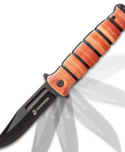An homage to the iconic fixed blade knife carried by Marines for decades, our USMC Combat Fighter Pocket Knife has the familiar stacked leather handle look. The sturdy TPU handle is 3-D printed to mimic the iconic stacked leather handle of the traditional Marine fixed blade knife and includes deeply grooved bands. The knife has a 4” razor-sharp stainless steel blade with a black, non-reflective finish, which can be deployed with flippers, to access the assisted opening mechanism. The officially licensed pocket knife is 4 3/4”, when closed, and features a pocket clip with a wire-cut “USMC” and a glass breaker.