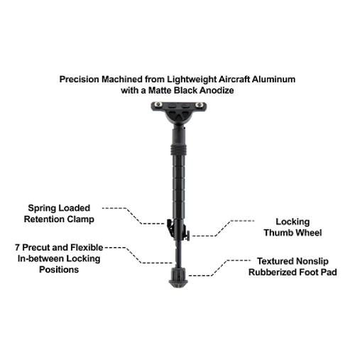 - Ergonomic spring-loaded slide locking ring for quick and effortless bipod deployment