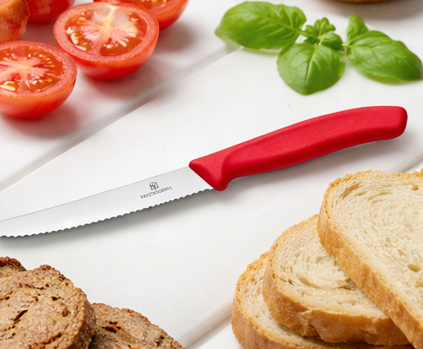 Victorinox Tomato Table Knife 11cm Serrated is a versatile kitchen knife designed for slicing tomatoes, fruits, vegetables, bread rolls, and everyday food preparation. Part of the Swiss Classic range by Victorinox, this knife features a sharp stainless-steel wavy (serrated) edge that easily cuts through soft skins without crushing the inside.