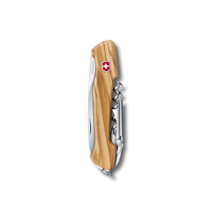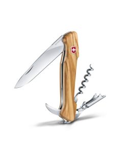 The Victorinox V0.9701.64 Ranger Wine Master also includes a unique olive wood handle, complemented by a short, wavy-edged beak-blade foil cutter and a large lock blade. The large blade is perfect for cutting cheese and culinary delicacies, while the two-step lever and handy bottle opener make uncorking a bottle easy. The set also includes a leather carry pouch for convenient transport.