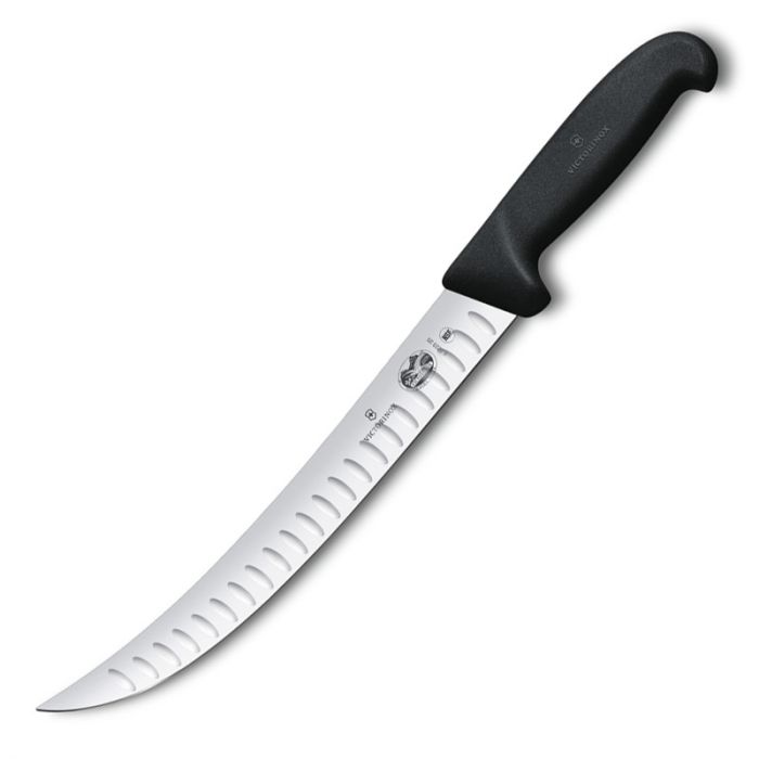 The long curved blade is efficient in breaking down carcasses and large quarters of meat into smaller roasts, separating meat from bone. Designed to give a full range cutting motion with a clean cut, while the fluted edge creates air pockets to assist with easy slicing and also butchering tasks.