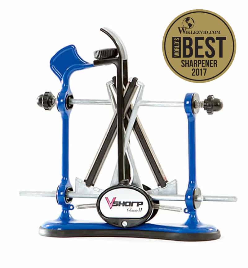 The V-SHARP® CLASSIC II uses two high quality, 325 grit diamond rods that sharpen the blade on both sides simultaneously using calibrated Spring Tension. Ideal for Kitchen, Fillet, Hunting and most other flat-blade knives. This high-quality model has a hand-crafted Steel Frame, Solid Rubber Base and durable Black Powder-coat finish.