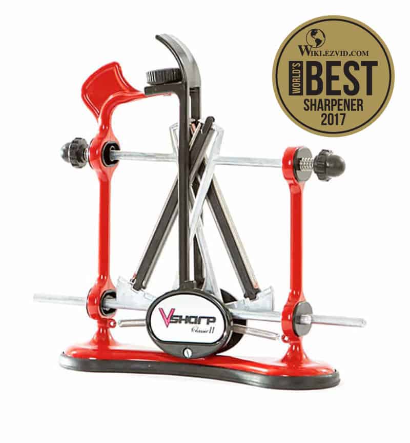 The V-SHARP® CLASSIC II uses two high quality, 325 grit diamond rods that sharpen the blade on both sides simultaneously using calibrated Spring Tension. Ideal for Kitchen, Fillet, Hunting and most other flat-blade knives. This high-quality model has a hand-crafted Steel Frame, Solid Rubber Base and durable Black Powder-coat finish.
