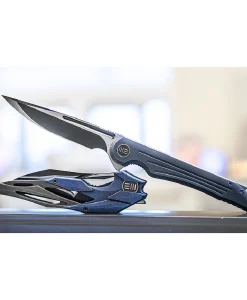 Introducing the We Knife 718A, a meticulously crafted knife featuring a sleek blue titanium handle and a stunning satin blade. With an overall length of 8.4 inches, this knife is designed for both functionality and style, making it an excellent addition to any collection or everyday carry setup.