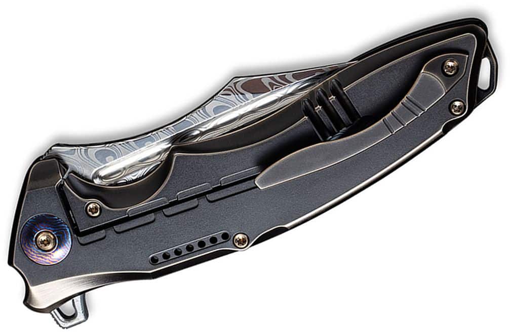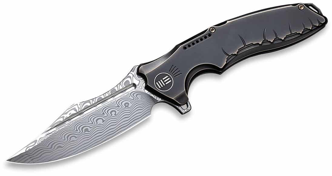We Knife 814DS-2 Chimera Antique Bronze Ti Handle Hakkapella Damasteel Blade
