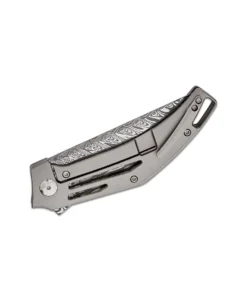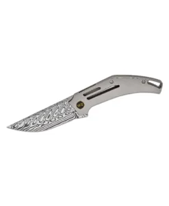 At its heart lies a 3.39″ drop-point blade forged from Hakkapella Damasteel. Renowned for its striking pattern and razor-sharp edge retention (59–61 HRC), this steel tackles everything from delicate slices to demanding tasks with effortless confidence. The flat grind ensures a fine, consistent cutting edge, while the mirror polish and acid-etch finish give the blade a luminous sheen that resists corrosion and highlights the steel’s natural beauty.